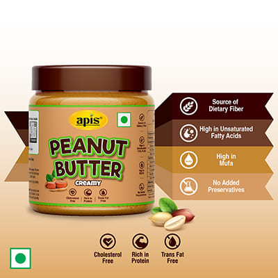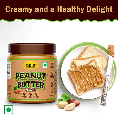 ApisCreamy Peanut Butteris one of the most popular spreads in India. Families seeking the delicious goodness of peanuts will love it. Our spreadable creamy peanut butter is a wonderful source of Vitamin E, Vitamin B3, and Vitamin B6, is high in protein and a wonderful source of fibre. Apis Creamy Peanut Butter spread's nutty flavour makes it an ideal choice for making peanut butter and jam sandwiches, cookies, smoothies, granola bars, and many other mouthwatering dishes.
